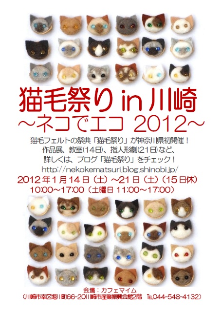 http://nekokematsuri.blog.shinobi.jp/infomation/%E6%9D%A5%E5%B9%B41%E6%9C%88%E3%81%AF%E9%A6%96%E9%83%BD%E5%9C%8F%E3%81%B8%E2%99%AA%E3%80%8C%E7%8C%AB%E6%AF%9B%E7%A5%AD%E3%82%8Ain%E5%B7%9D%E5%B4%8E%E3%80%8D来年1月は首都圏へ♪「猫毛祭りin川崎」