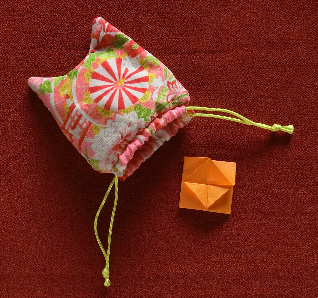 小さいですが、口べり布をつけ、和裁の「四つ縫い」で仕立てます。一度覚えれば、袋物作りのときに応用できますよ。