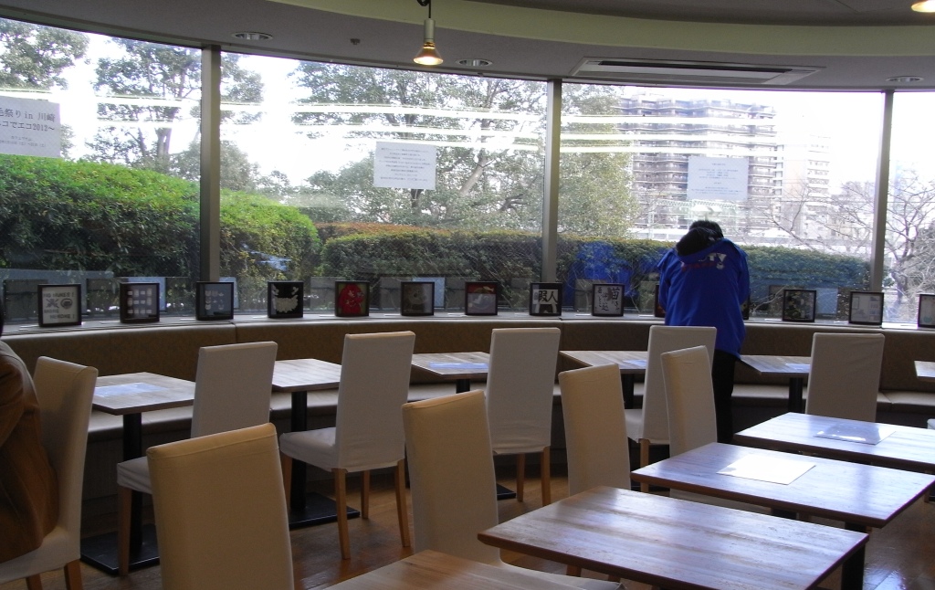 会場の雰囲気はこんな感じ。大きな窓が開放感あふれるカフェで、作品の額をその前に展示してあります。