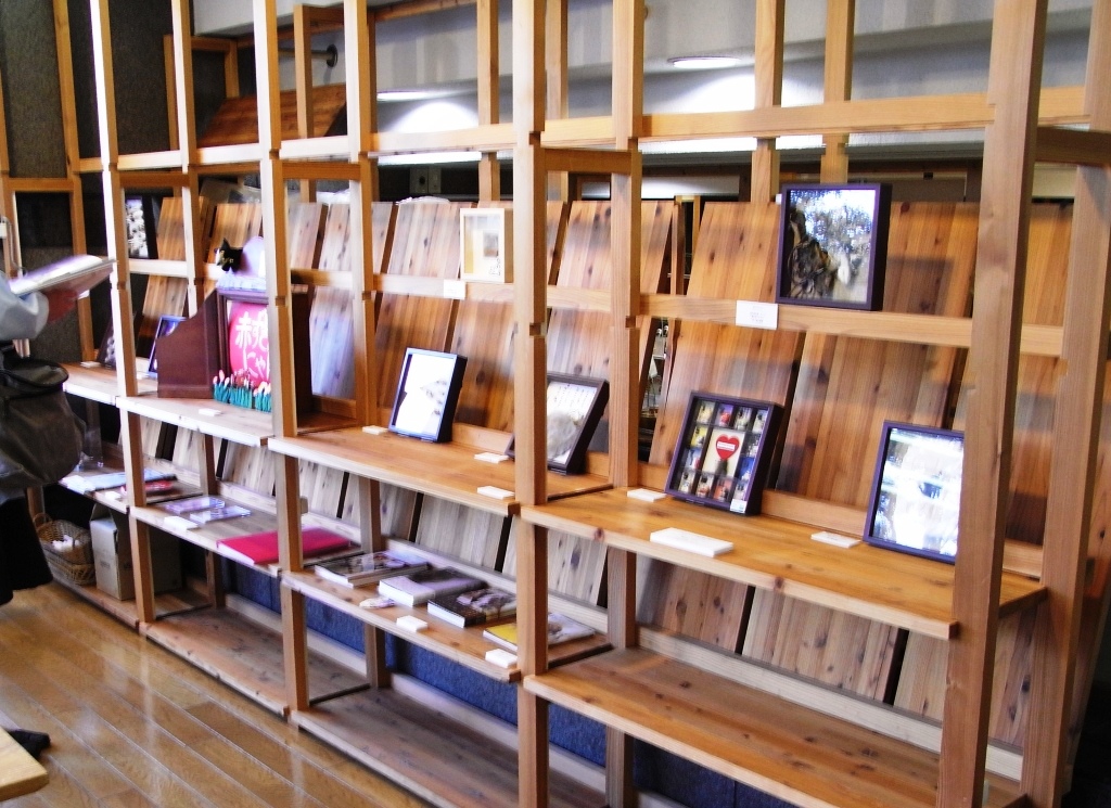 窓に面した位置には温かみのある木製の棚があり、そちらにも作品を展示。書籍やキットも販売しています。