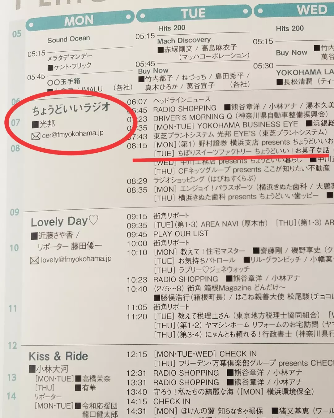 「ラジオカーの街角情報や午後からのお出かけに役立つ話題などを盛り込みながら、日々の暮らしのど真ん中を、それぞれのカラーで彩ります」という番組で、月~木曜日の10:00~14:00オンエア。