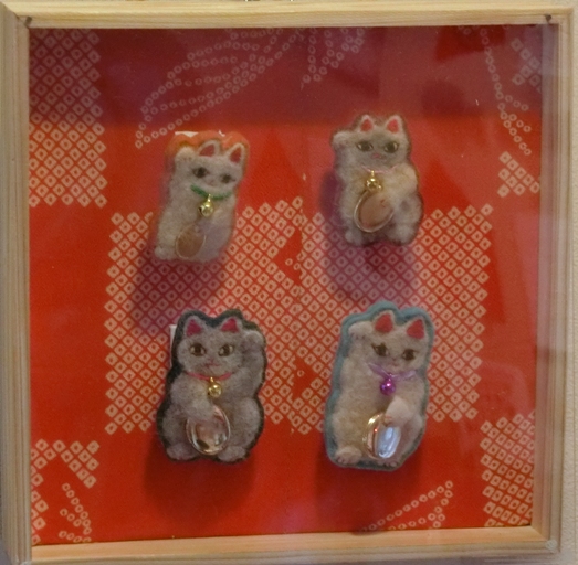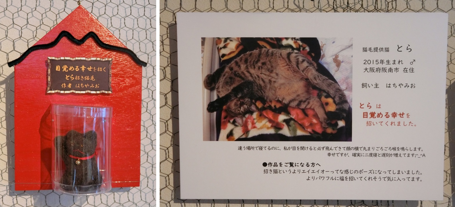 今回のテーマ作品「招き猫毛」を中心とした作品展や教室のほか、猫毛フェルトグッズや、地元猫アクセサリー作家さんの作品も展示販売。会場の今井酒造店さんの「くらネコ」ラベルのおいしい日本酒もあります♪