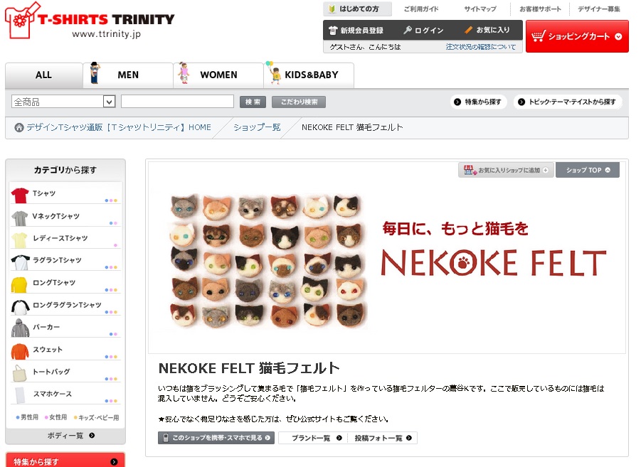 猫毛フェルトの作品写真をプリントしたTシャツ、トートバッグなどを販売しています。