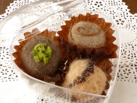 午前・午後とも、猫毛をくるくる丸めて玉にして作るアイテム。簡単に作れてしかもそれっぽく、フランスのかたにも「オオ!トリュッフ!!」と、とってもうけた作品です♪