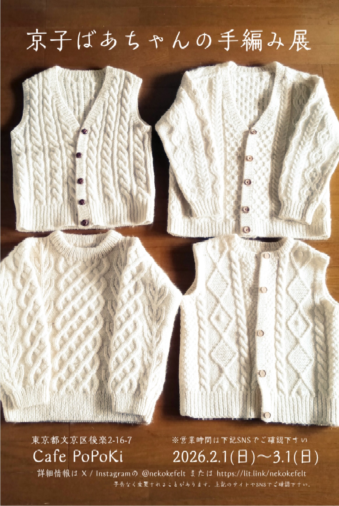 2026年2月、猫毛フェルターの母、京子ばあちゃんが遺した手編み作品を展示します。