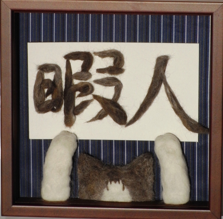 前回に続き、「猫毛書」のシリーズです。こちらは黒っぽい毛を使ったので、画像だと普通の書に見える、とのお声も。でも、「人」の文字の右下の「はね」が紙から出ているので、書いた文字ではない証拠。次回作では、猫毛書のこの特徴をもっと押し出そうと思っております。
