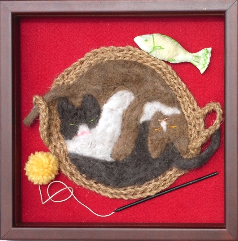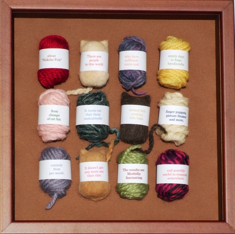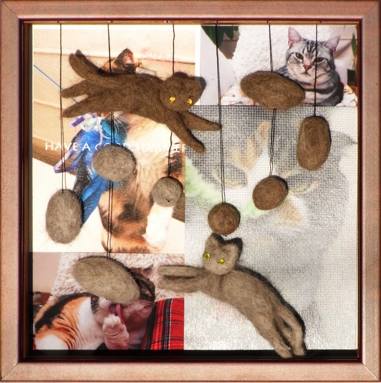 今回の展示では、自作の作品をご出展なさるのに加えて、猫毛提供をしてくださった方もおいでになります。トロNEKOさんもそのお一人。「猫毛祭りin京都」の会場、キトゥンカンパニーさんで、猫写真展を開かれたこともあるトロNEKOさんのお写真と、組み合わせました。