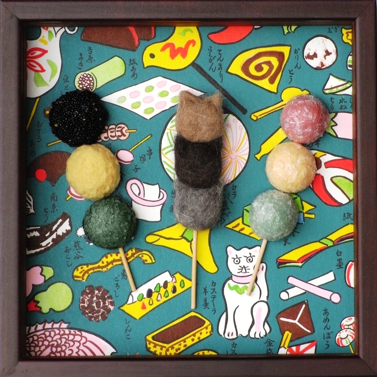 ということで三色団子になりまして、向かって右に京都「豆政」のすはまだんご、左には東京「埼玉屋小梅」の小梅だんごをとり合わせ。東西の名物は、さすがに猫毛で作るのは控えました。背景に使った千代紙は東京「菊寿堂いせ辰」の「仙台駄菓子づくし」(石橋幸作筆)。お菓子な猫たちのお菓子な額になりました。