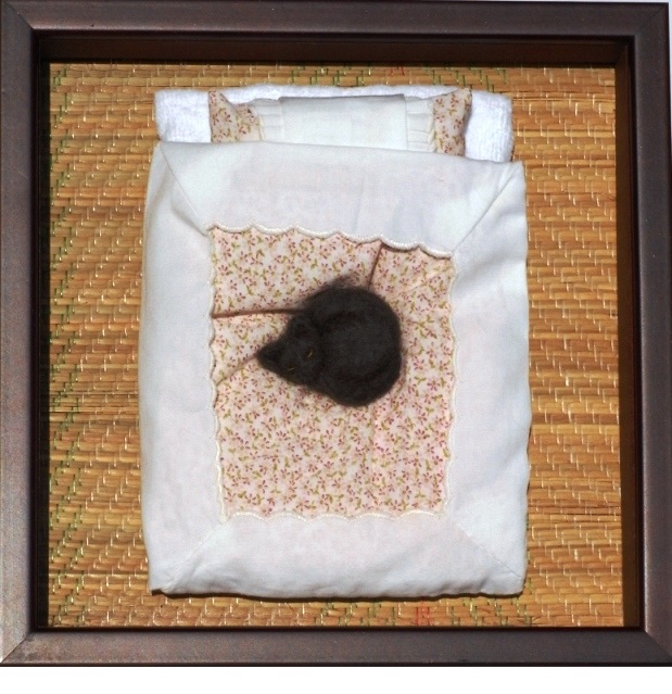 今回は、当方の身近な猫たち、黒猫「ち」と、姉の猫ゆきちゃんの毛で人形を作り、それを託して作品にしていただいたものです。