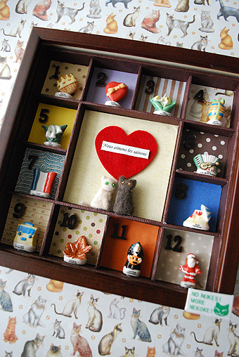所蔵なさっているフェーヴをふんだんに使って、お得意のカルトナージュの技法で、小さきものを愛する思いがあふれた可憐な作品を作ってくださいました。