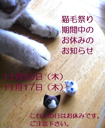 11月10日木曜日、猫毛祭り会場のキトゥンカンパニーさんはお休みです。11日金曜日以降にご来店ください。