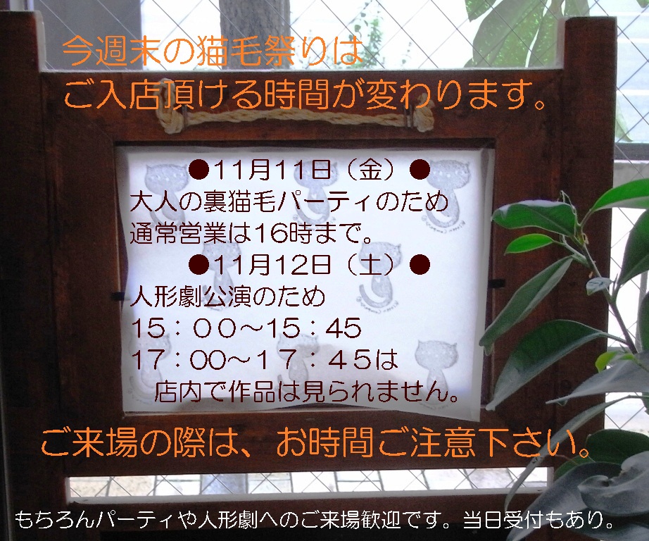 今週末は、猫毛祭り催し物の開催のため、通常営業の時間が変わります。
