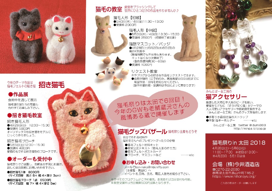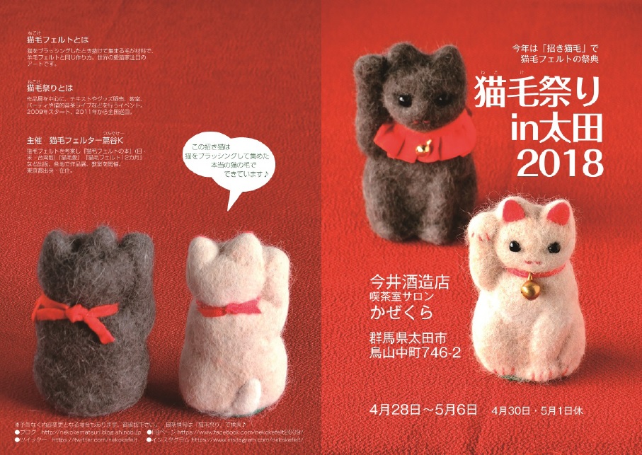 http://nekokematsuri.blog.shinobi.jp/nekoke-matsuri/oota20184月28日~5月6日開催!「猫毛祭りin太田2018」