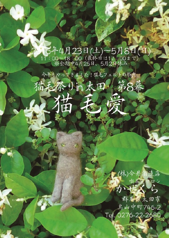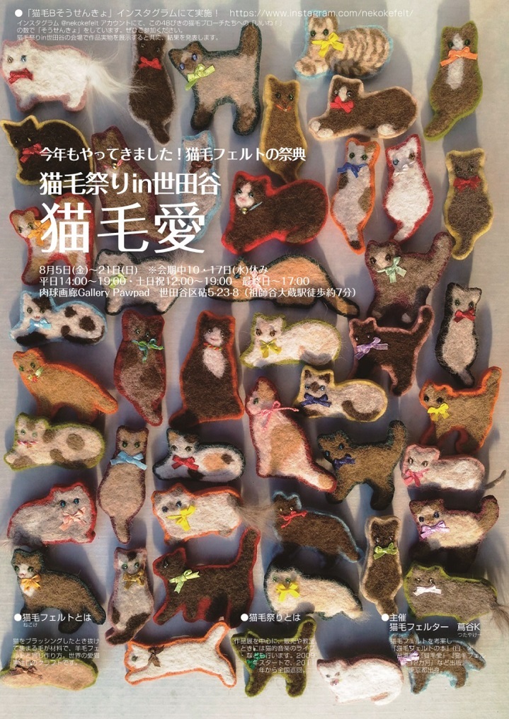 http://nekokematsuri.blog.shinobi.jp/8th/8%E6%9C%885%EF%BD%9E21%E6%97%A5%E9%96%8B%E5%82%AC%EF%BC%81%E3%80%8C%E7%8C%AB%E6%AF%9B%E7%A5%AD%E3%82%8Ain%E4%B8%96%E7%94%B0%E8%B0%B7%E3%80%80%E7%AC%AC8%E5%B9%95%EF%BD%9E%E7%8C%AB%E6%AF%9B%E6%84%9B%EF%BD%9E%E3%80%8D8月5~21日開催!「猫毛祭りin世田谷 第8幕~猫毛愛~」