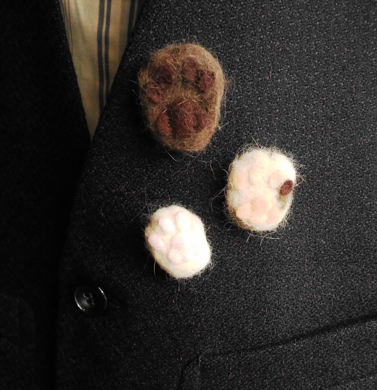 『もっと猫毛フェルトの本』の巻頭で、肉球ストラップとして紹介した作品をバッジにしたもの。もちろん、ストラップにもアレンジできます。