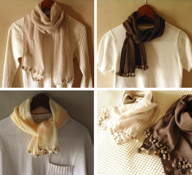 サンプル画像は当方の好みなので渋い色ばかりですが、もっと鮮やかな色やかわいい色も選んでいただけます。お好きなストールをお持ちいただき、そちらに付けるのも可能です。
