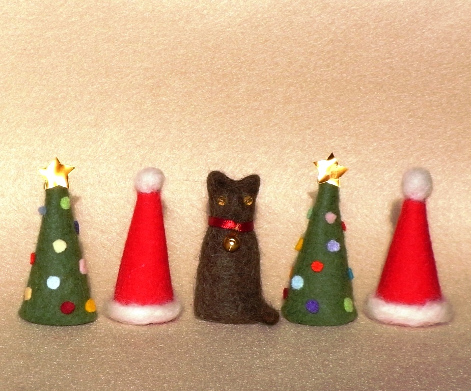 偶数月の作品は猫毛フェルト人形です。12月はフェルトでツリーや帽子を作って添えて、クリスマスっぽく飾るご提案をします。