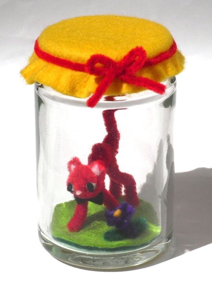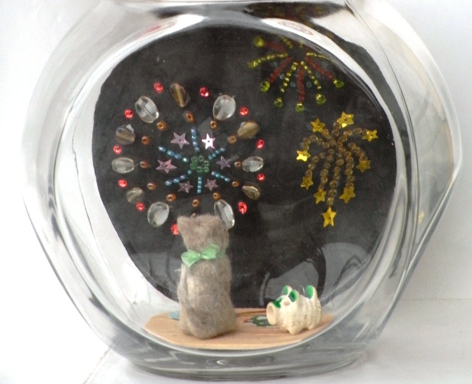 1月から12月まで12個ある当方のびん作品は、つるして展示することになりました。斬新な展示スタイルですが、しっくりくるので不思議です。これもキトゥンマジックでしょうか。