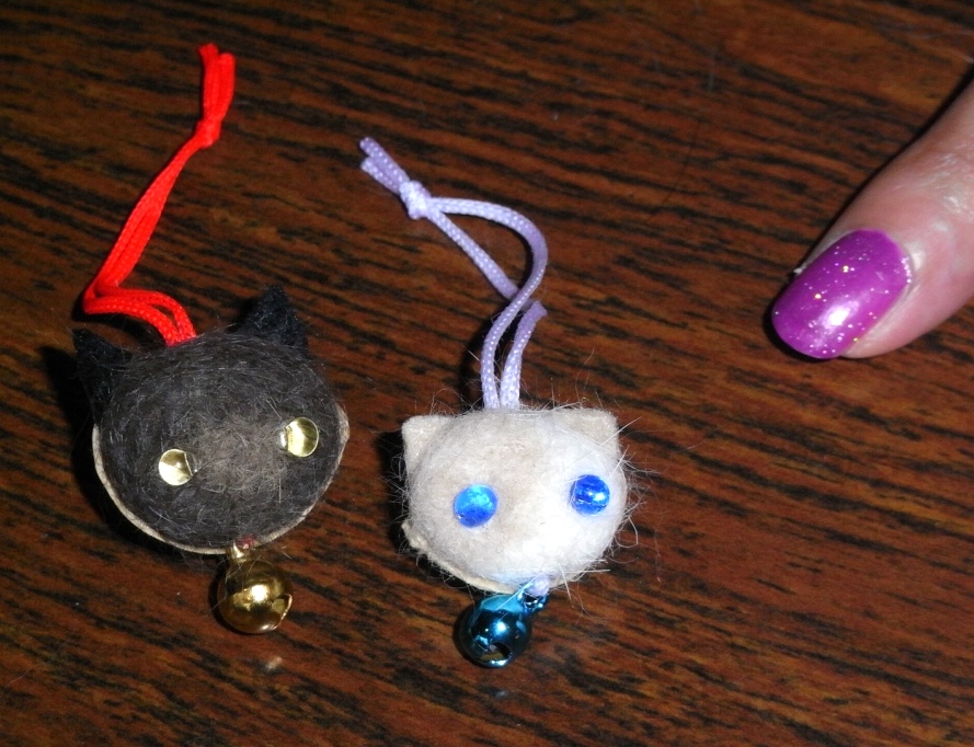 画像は京都精華大学の学生さんお二人が作ったぎんなん猫。写真では見えづらいですが、白いほうは顔半分にベージュの模様、黒いほうは鼻づらだけグレイに色分けしてある、ひと手間かかった作品です。