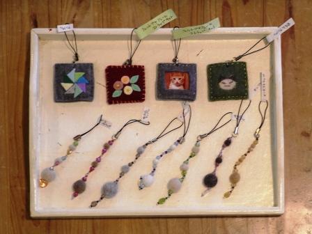 こちら、愛猫の写真を入れ、裏には猫毛で模様を付けられる、フェルトプチフレームストラップと、猫毛フェルトボールとビーズのストラップ。(各800円)