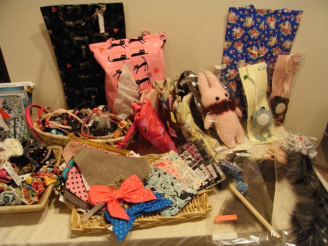 会場にはかわいい猫グッズもいっぱいです。高松の猫グッズショップ「きゃっとばけーしょん」さんからの品々。 猫おもちゃにティッシュケース、カワイイ首輪などなど!