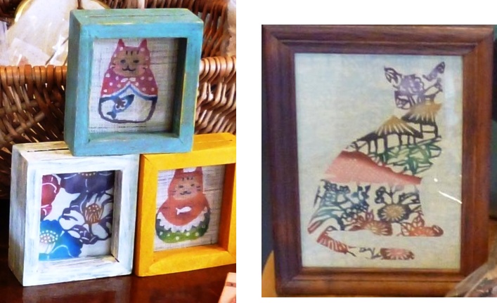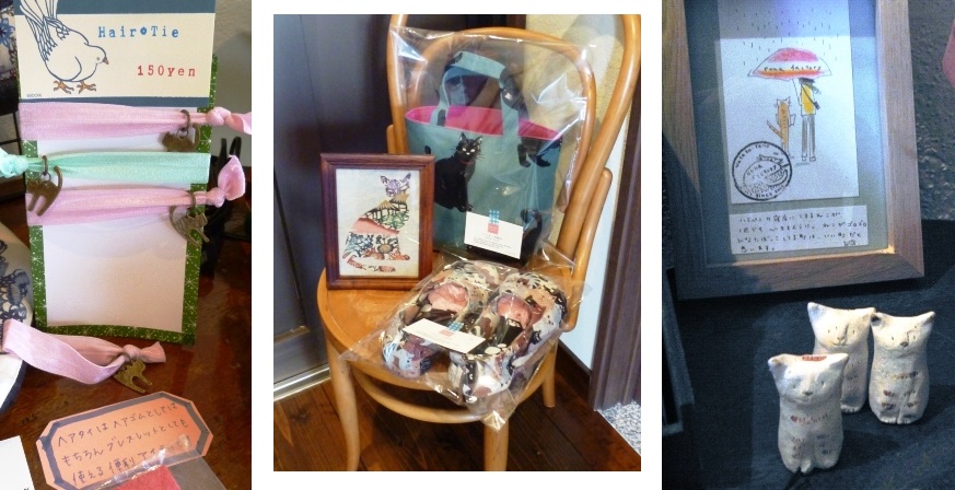 品物は、ポストカードやバッジ類、そしてちりめん猫など。(ご注意:WSではなく全て完成品の販売です。ご注意その2:画像中の猫は会場には行きません)