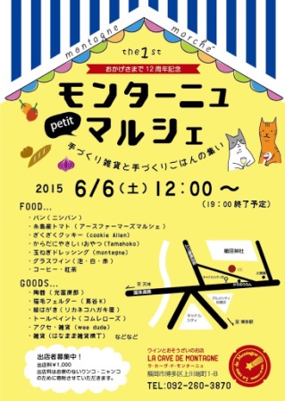 福岡のワインとお惣菜のお店「ラ・カーヴ・ド・モンターニュ」で開かれる手作り雑貨と手作りごはんの集い「モンターニュマルシェ」に、猫毛もお声かけていただき、参加することになりました。