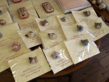 今回は出展するもの全品(たぶん)販売予定です。猫顔バッジ、フェルトonブローチ、猫毛薔薇の他、新作の招き猫バッジも。