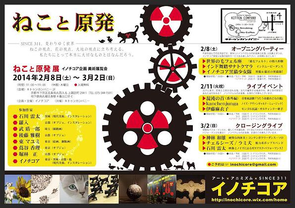 イノチコア主催「ねこと原発」展が、猫毛祭りオープニング会場でおなじみ京都キトゥンカンパニーさんで開催されます。不肖蔦谷Kもその展示に参加、そしてオープニングパーティの2月8日に毛フェル座が公演を行います。
