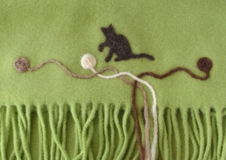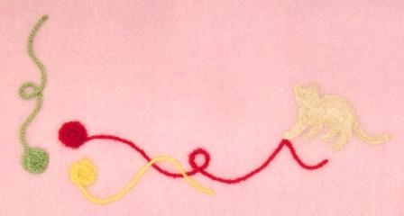 猫の毛のフェルト、猫をブラッシングして集めた毛で作る「猫毛フェルト」は、猫毛人形のような立体物だけではなく、布にさしつけて刺繍のように模様をつけることができます。