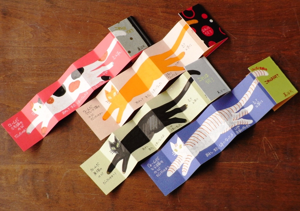 いろいろな紙で作ってますが、ストーリー(というほどでもない)は同じ。めくっていって最後に、じゃばらになっているページ全体を伸ばすと、「な~るほど、猫のその件ね」とオチがつく、というしかけです。
