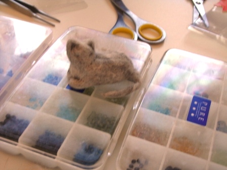 魚を前肢でちょちょいっとしているポーズを、フェルト針でさし付けました。