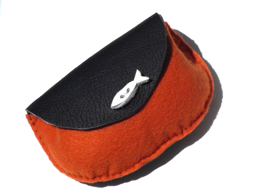 かぶせと本体背面が革、前面が手芸用の厚手のポリエステルフェルトで、革の魚型ボタンをつけました。